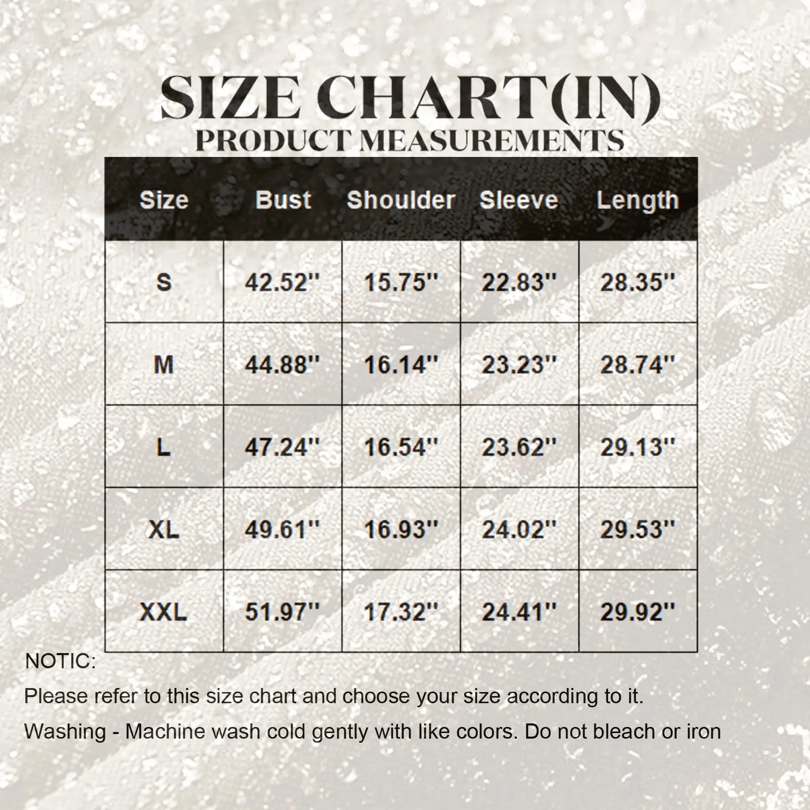| Size | Bust | Shoulder | Sleeve | Length |
